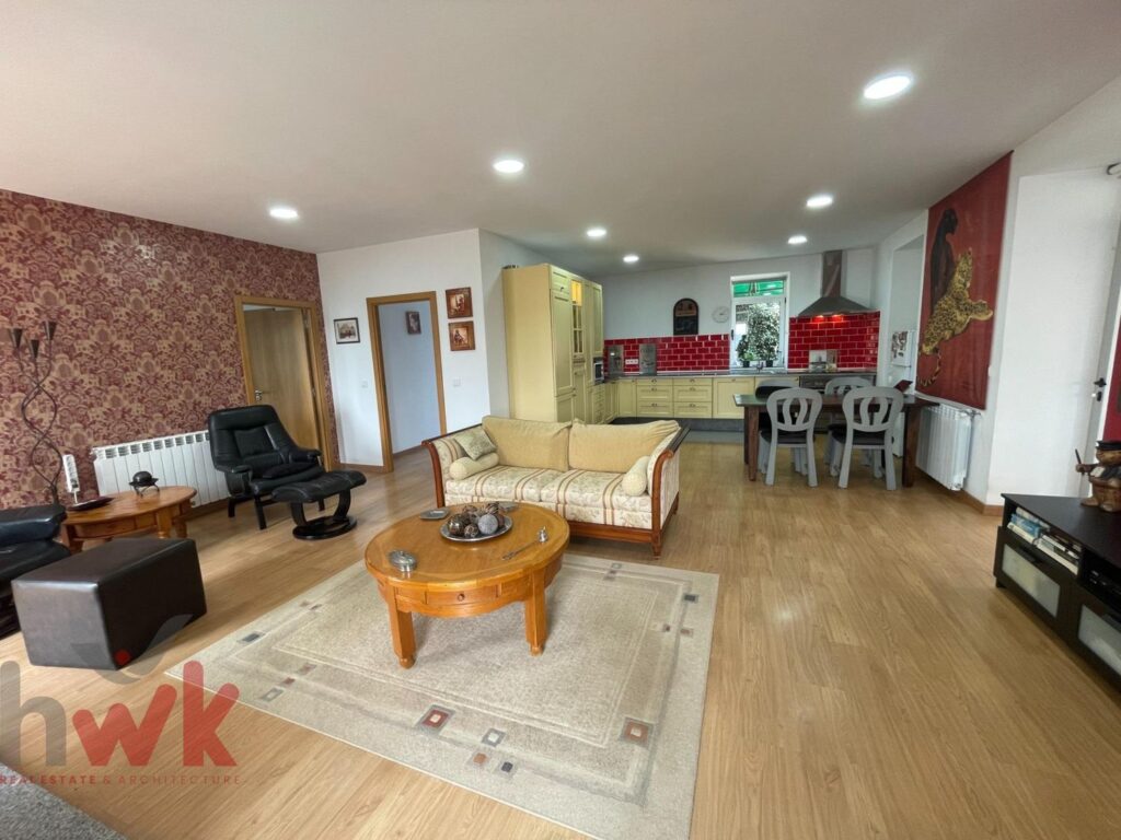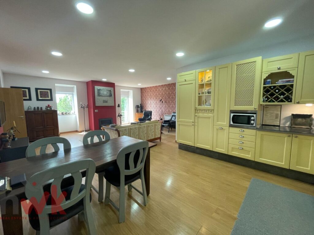 séjour ouvert avec cheminée et chauffage central au bois,