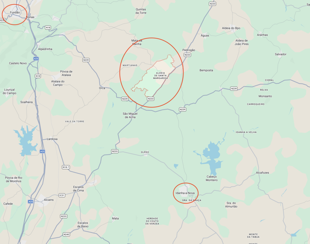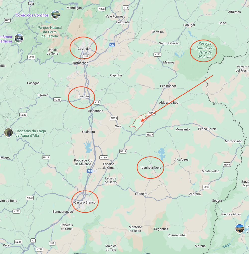 Axes routiers : estrada municipal vers la EN233. Accès à l’A23 (autoroute) à Castelo Branco, 35-40 minutes de route.