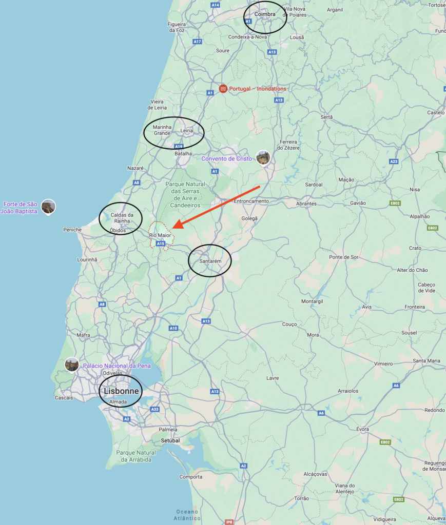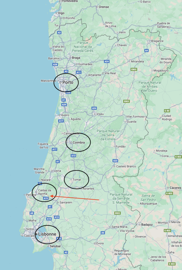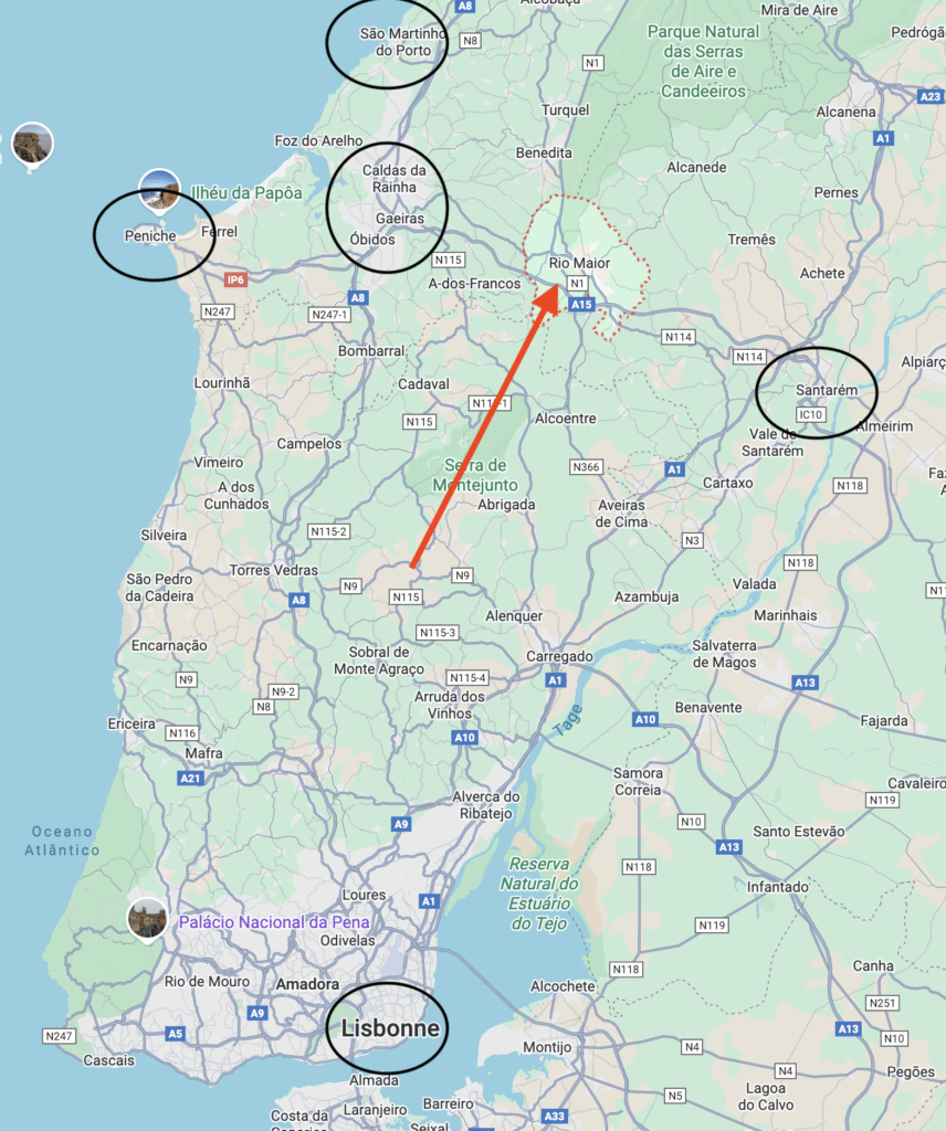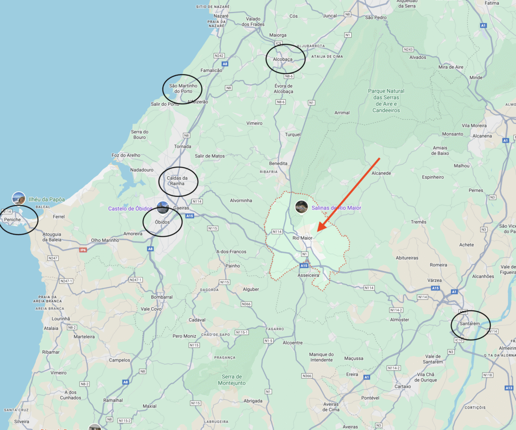 C’est aussi plus près de l’océan, des villes balnéaires de Peniche, Foz do Arelho, Sao Martinho do Porto (qui n’est pas loin de là proche de Porto). Et très proche de la très agréable ville de Caldas da Rainha.